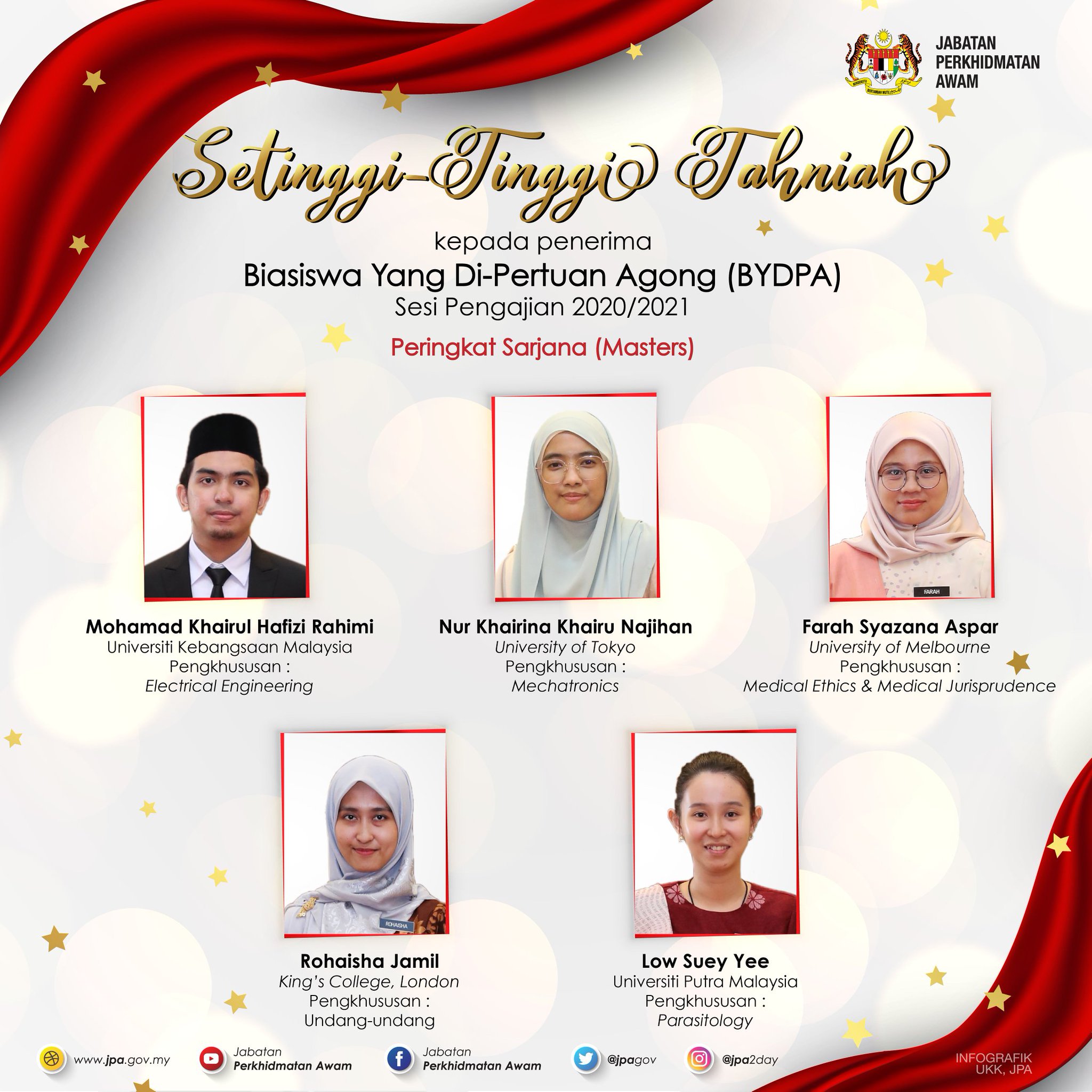 Jabatan Perkhidmatan Awam JPA mempelawa semua warganegara Malaysia yang layak untuk memohon Biasiswa Yang di-Pertuan Agong BYDPA Tahun 2021 secara dalam talian online. Permohonan adalah dipelawa daripada semua warganegara Malaysia yang berkelayakan untuk memohon Biasiswa Yang di-Pertuan Agong BYDPA Sesi Pengajian 2020 2021 bagi mengikuti pengajian di peringkat Sarjana dan Kedoktoran PhD di dalam dan luar negara. Permohonan adalah dipelawa daripada semua warganegara Malaysia yang berkelayakan untuk memohon Biasiswa Yang di-Pertuan Agong BYDPA Sesi Pengajian 20202021 bagi mengikuti pengajian di peringkat Sarjana dan Doktor Falsafah di dalam dan luar negara dalam bidang Sains dan Teknologi Ekonomi Undang-undang dan Kewangan Islam.