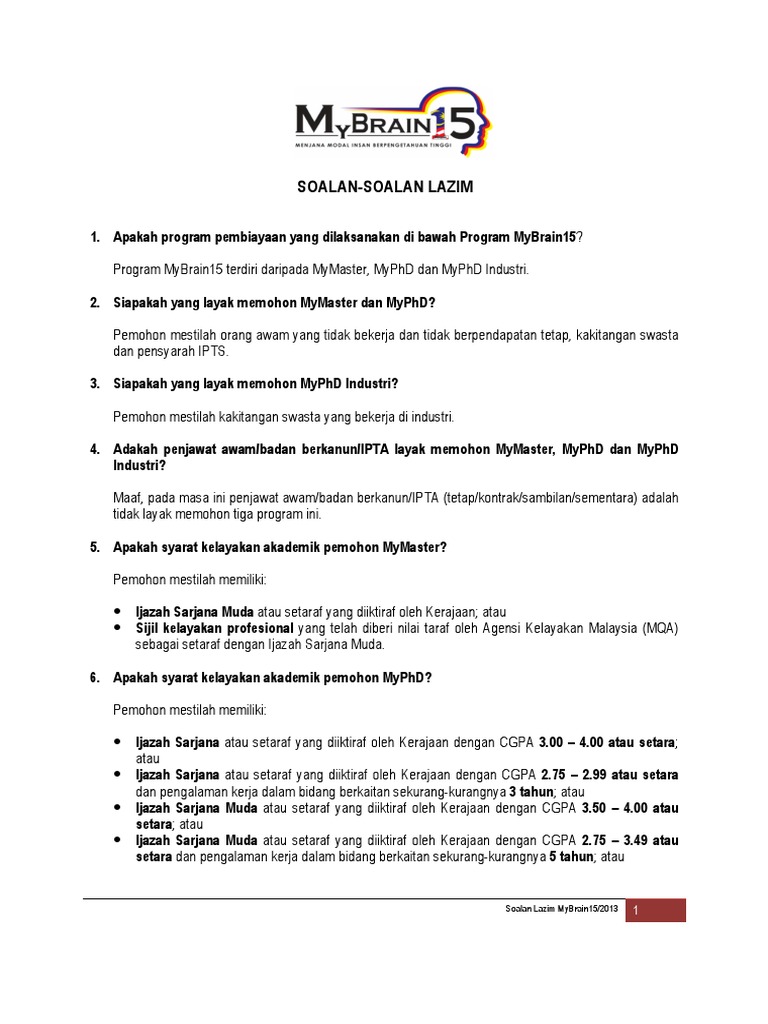 Saya ditawarkan biasiswa MyBrain15 untuk Master program. Pelajar akan ditaja di peringkat ijazah pertama di Universiti Awam Politeknik Premier dan Government Linked University GLU yang telah ditetapkan oleh Jabatan Perkhidmatan Awam JPA. A A-Mutakhir ini keputusan yang diumumkan oleh.