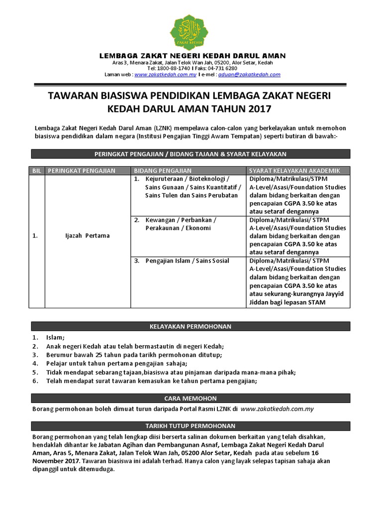 Antara syarat-syarat kelayakan Biasiswa Pendidikan Lembaga Zakat Negeri Kedah adalah seperti berikut. Iii Berumur bawah 25 tahun pada tarikh permohonan.